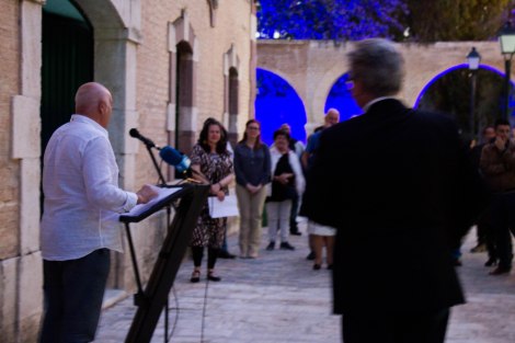 Antonio Roa presentando el VI Encuentro, al fondo a la izquierda, Adriana Manuela Ruíz Gómez preparada para inaugurar su proyección Danaides; a la derecha Esteban Morales, alcalde de Puente Genil, entre otros asistentes.